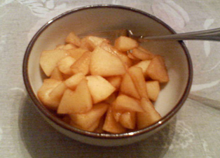 いや、レンジのシナモン臭がどうしても気になってしまったので、皮剥いて切ってフライパンで煮てみました<アレンジどころか別物になりつつ…orz