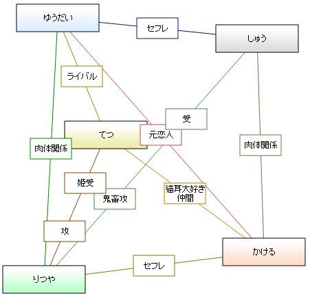 雄大と肉体関係、オードリーとセフレ、蹴に対して鬼畜攻め、テツに対しても攻め(しかし、テツの姫受けって何だろう?)